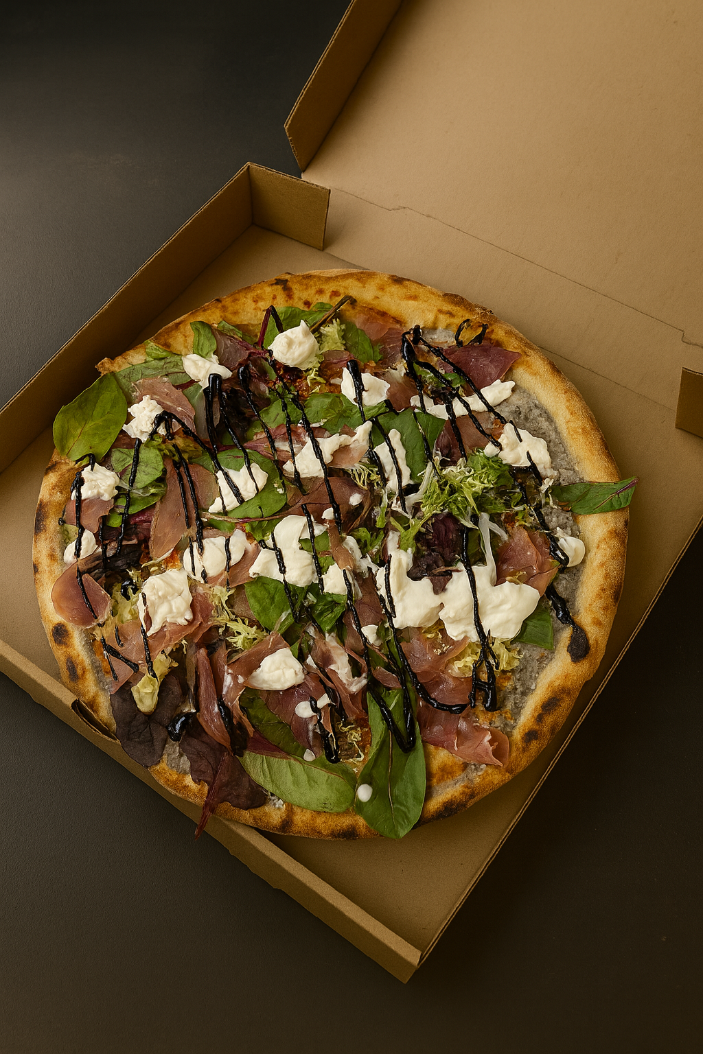 Crème truffade, Mozzarella, Salade, Jambon cru, Burrata, Crème de balsamique