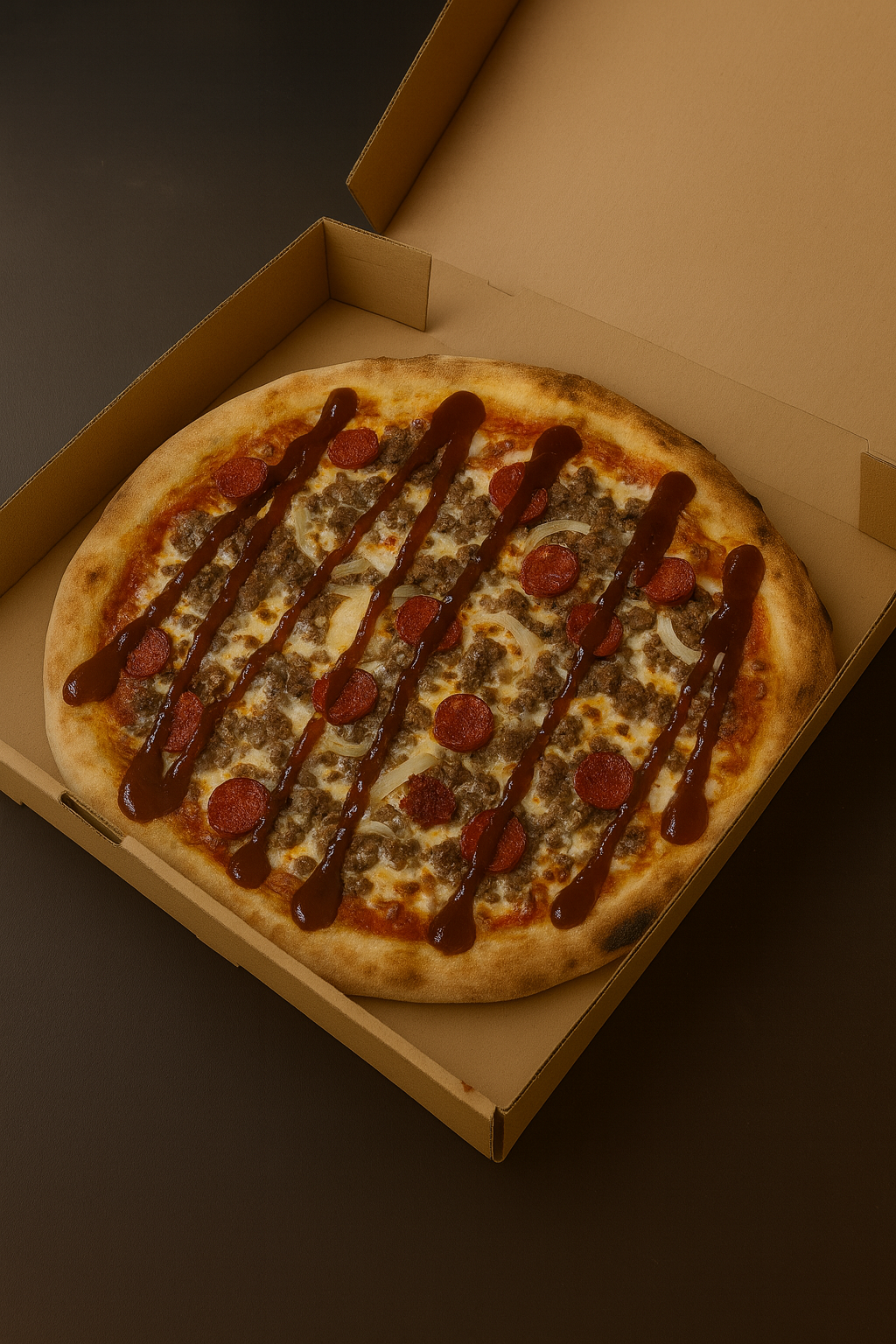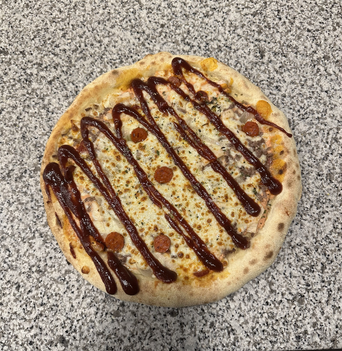 Crème sauce, Viande hachée, Poulet, Merguez, Oignon, Mozzarella, Sauce barbecue