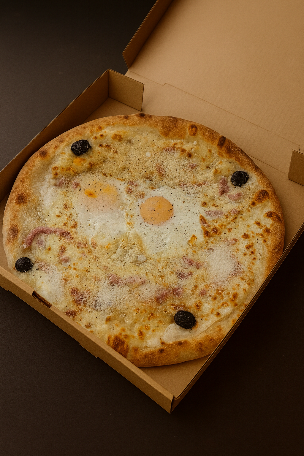 Crème,oignons,lardons,2 œufs,mozzarrella grana padano, olives, origan