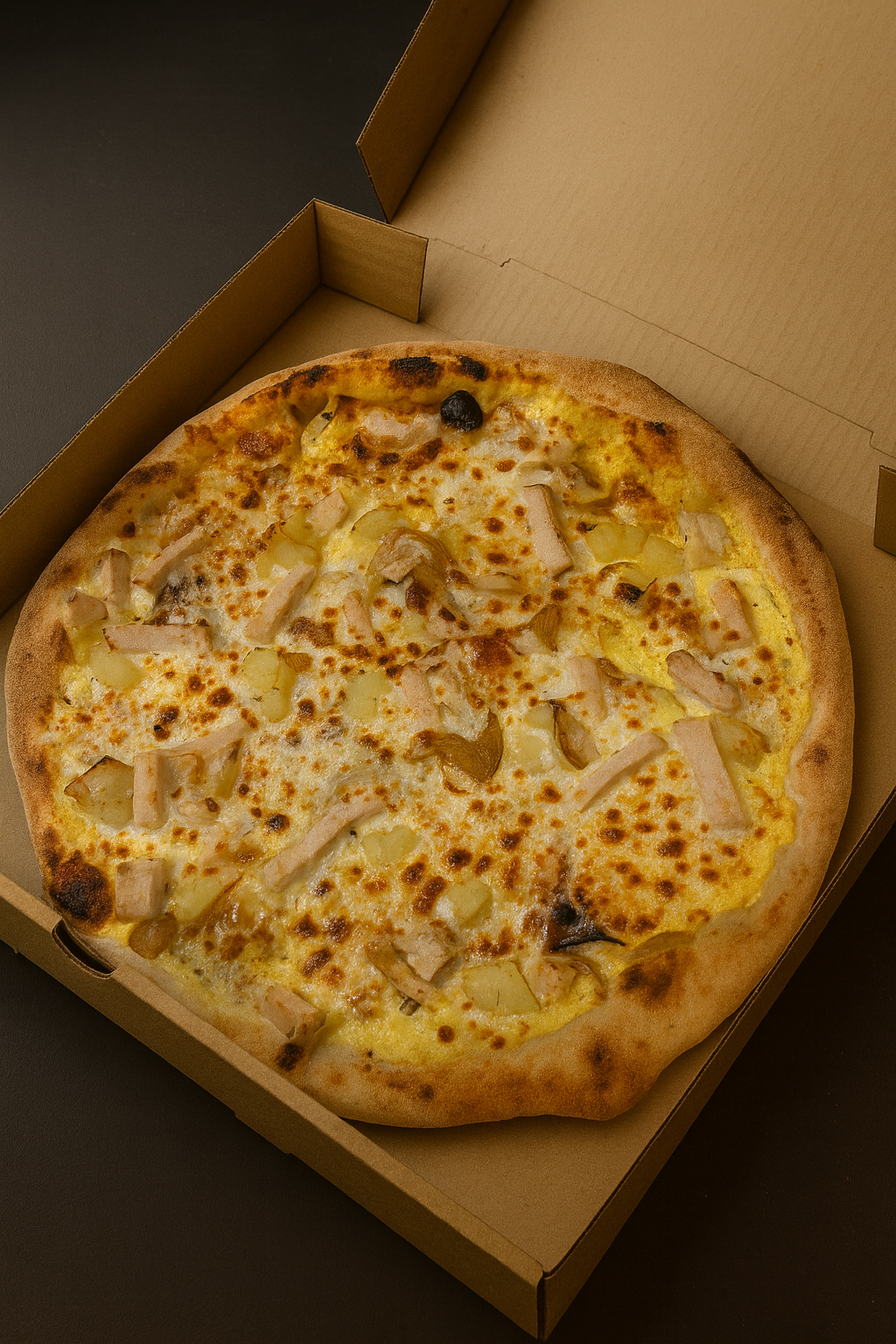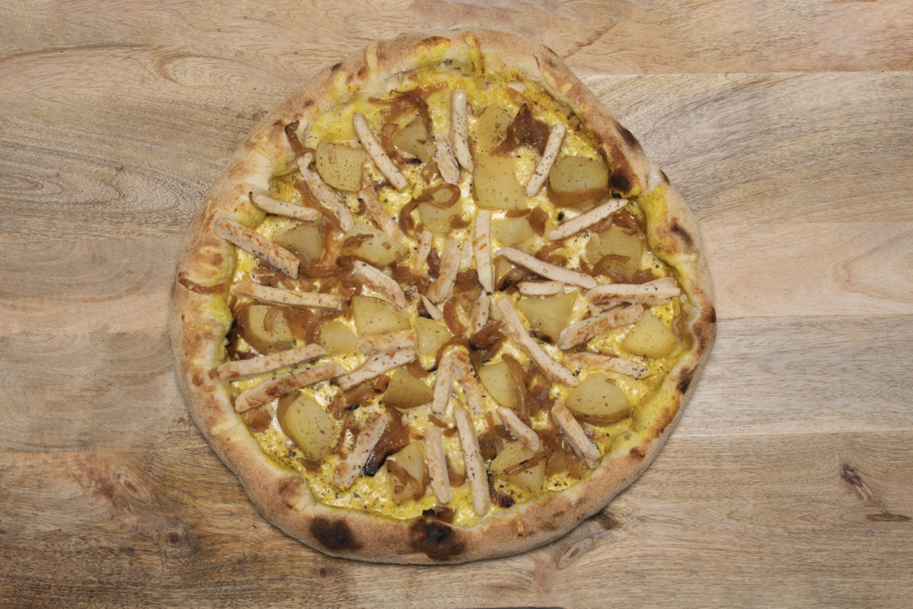 Crème, curry,poulet, oignons, pomme de terre mozzarella, origan
