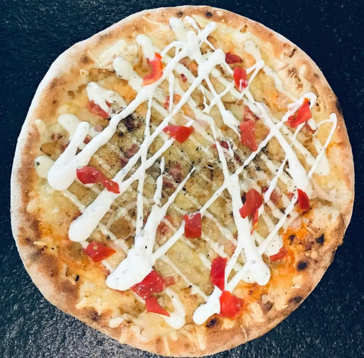 Crème, sauce,kebab, tomates fraîches, salade, oignons, mozzarella, sauce blanche , origan