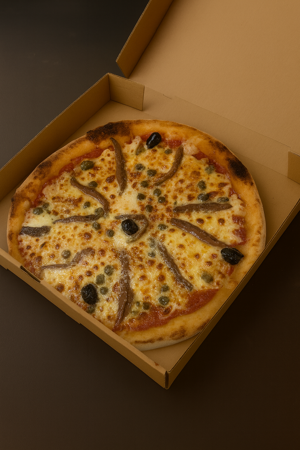 Sauce, anchois, câpres, mozzarella, emmental, olives, origan