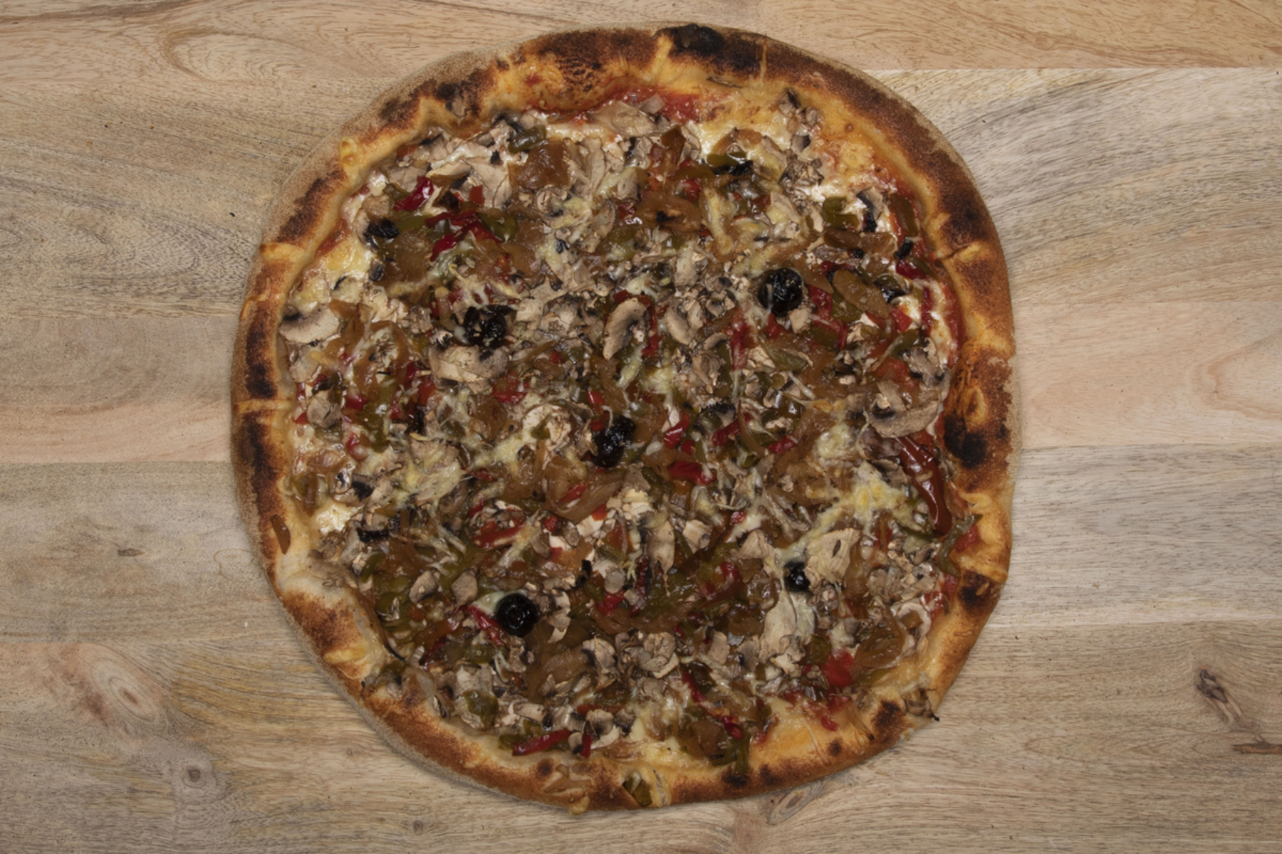 Sauce oignons,poivrons, champignons, mozzarella,huile d'olive, olives, origan