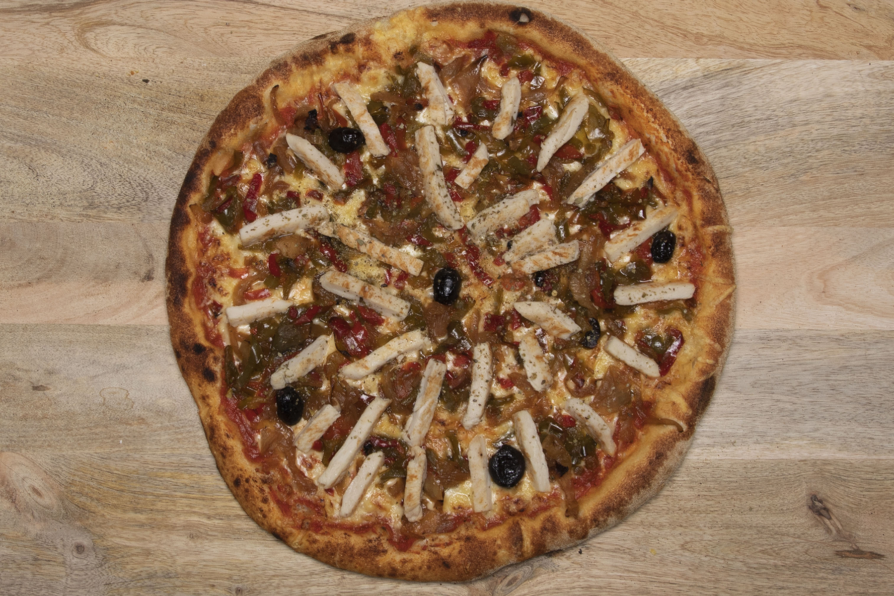 Sauce, poulet, poivrons, oignons, mozzarella , olives, origan