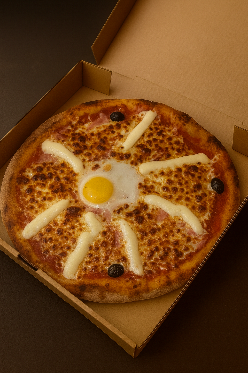 Sauce jambon,brousse, mozzarella oeuf,mozzarella, olives, origan