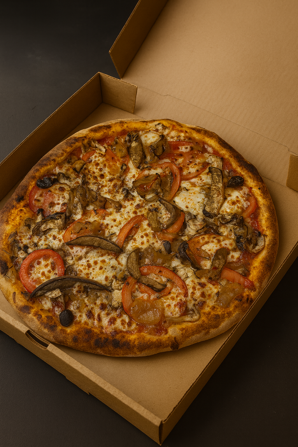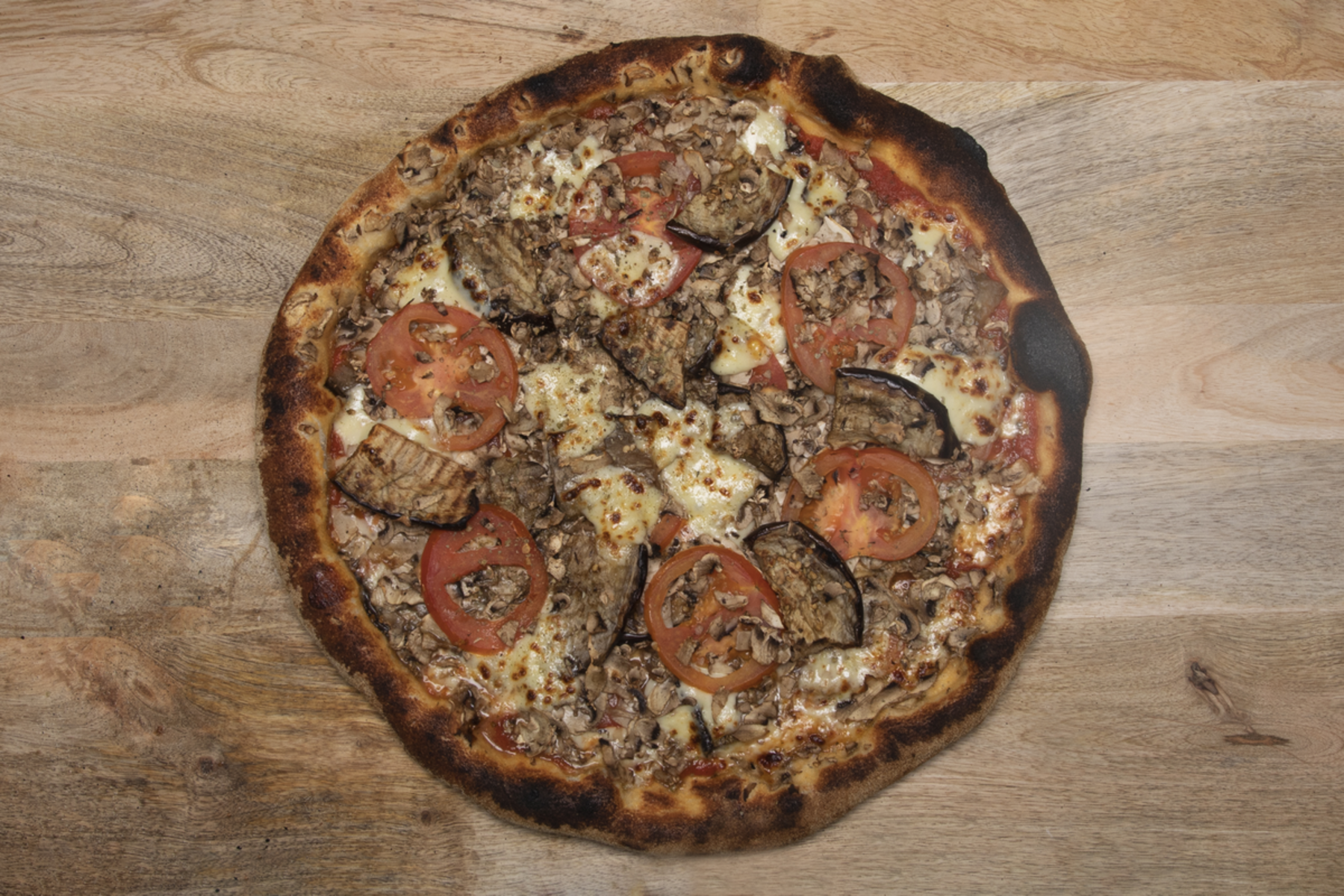 Sauce, aubergine, tomates fraîches, champignons, oignons, mozzarella olives, origan